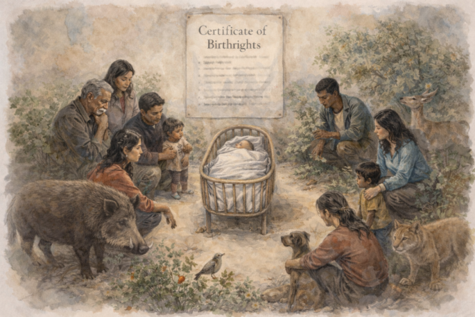 While this framing might make sense through the perspective of modernity – where life is organized around ownership, contracts, individual sovereignty, and accumulation – from a wider-angle lens, it is oddly specific and historically recent. In many non-modern ontologies, being born is not a claim but an arrival into obligations: to land, to ancestors, to those not yet born, to non-human kin, and to the continuity of life itself.